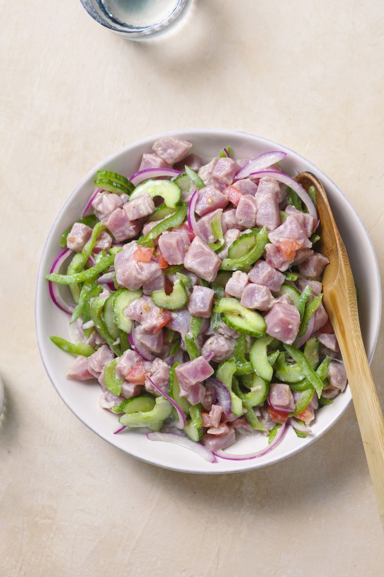 - Pela y pica el tomate, la zanahoria, el pepino y la cebolla y resérvalos en un bol. Mezcla el pescado y las verduras, adereza con el jugo de lima y espolvorea con perejil picado.